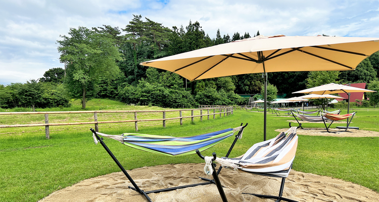 パラソルが並ぶ白砂のエリアに、心地よく揺れるハンモックを配置したリラックススペース。まきば園を吹き抜ける風を感じながら、ゆったり身体を預けることができます。 空を眺めて揺られるだけで気分がほどけていくような、訪れる人に人気の憩いのスポットです。
