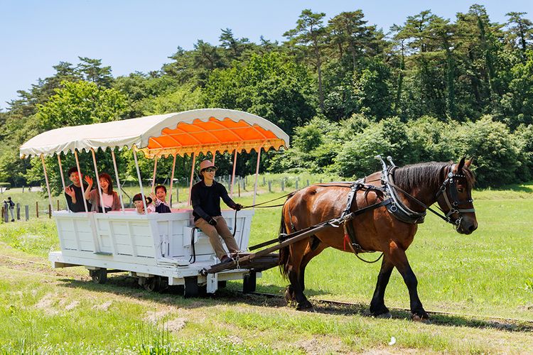 牧場をのんびり巡るクラシカルな馬車体験。穏やかな馬に引かれながら、ゆったりと牧場内を巡る人気アクティビティです。 明治37年から半世紀、農場内の交通手段として活躍した馬車鉄道を再現。当時の鉄路を再利用しています。