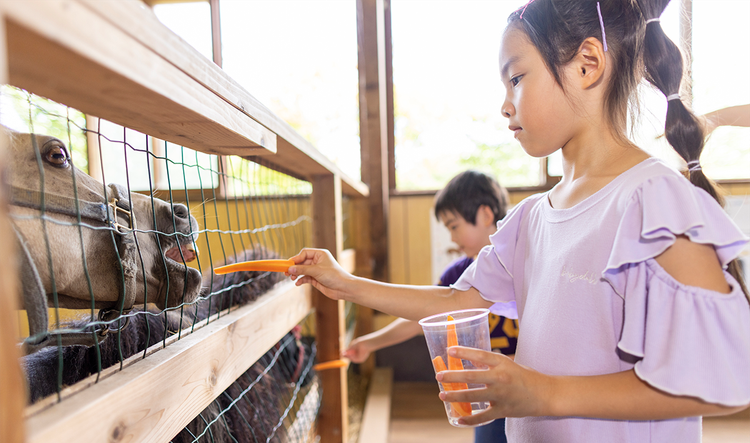 やさしい眼差しの馬たちに間近で餌をあげられる人気のふれあい企画。馬がゆっくりと近づいてくる姿やおいしそうに食べる表情を間近で見られ、動物の温かさを実感できます。